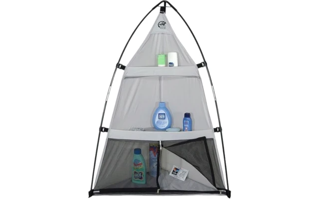 Freistehender Zeltorganiser mit drei Ablagen. Unterste Ablage mit Moskitonetz. Kompaktes Packmaß.