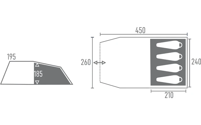 • Vordach: Der Vordereingang kann als Sonnensegel aufgestellt werden und bietet zusätzlichen Schutz vor Sonne und Regen